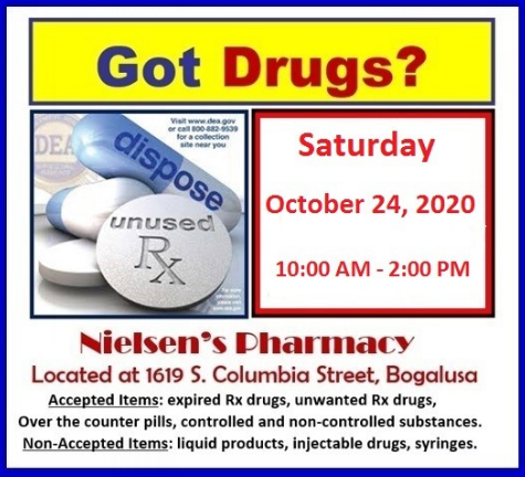 The Bogalusa Police Department will be conducting a National Drug Take Back Day this Saturday in the parking lot of Neilsen’s Pharmacy, located at 1619 S. Columbia St. in Bogalusa, Louisiana.