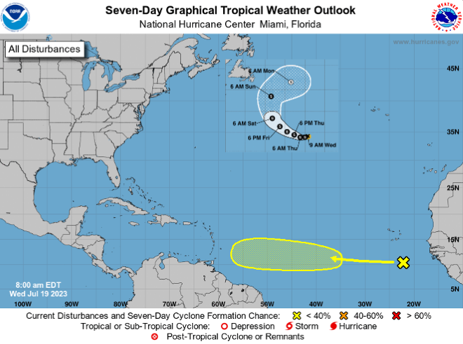 Disturbance 2. A tropical wave is located over the eastern tropical Atlantic centered a few hundred miles south of the Cabo Verde Islands. Environmental conditions could become more conducive for some development by this weekend while the wave moves westward across the central tropical Atlantic at 15 to 20 mph. Formation chance through 48 hours...low...near 0 percent and formation chance through 7 days...low...20 percent.