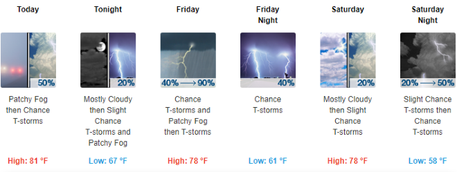 Today A 50 percent chance of showers and thunderstorms, mainly between noon and 5pm. Patchy fog before 9am. Otherwise, partly sunny, with a high near 81. South wind 5 to 15 mph. New rainfall amounts of less than a tenth of an inch, except higher amounts possible in thunderstorms.