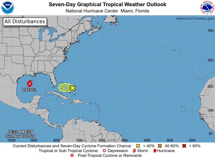 Disturbance 1. Tropical Storm Rafael is gradually weakening with maximum sustained winds now at 40 mph. Rafael is moving toward the north-northwest near 2 mph. The storm is expected to meander over the central Gulf of Mexico through tonight, then turn toward the south and south-southwest on Monday and Tuesday. Weakening is expected through early next week, and Rafael is forecast to degenerate to a post-tropical remnant low by Monday. There are no coastal watches or warnings in effect.